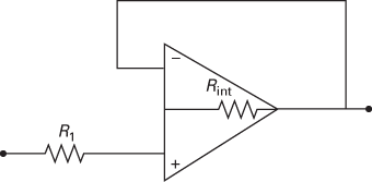 What is most nearly the output impedance, R out, of the circuit shown? Assume no current is drawn at the (+) and (−) inputs, and that the op amp has a small internal resistance, R int, at the output.